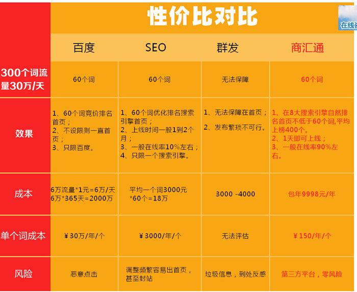 1、網(wǎng)絡(luò)營銷成為新時(shí)代的寵兒!互聯(lián)網(wǎng)的發(fā)展,讓越來越多的人開始重視并選擇網(wǎng)絡(luò)營銷推廣!網(wǎng)絡(luò)營銷大大改變了企業(yè)的營銷方式! 二.企業(yè)網(wǎng)站宣傳推廣新助手-商匯通 "商匯通"是國內(nèi)首家專注于搜索引擎首頁精準(zhǔn)營銷的電子商務(wù)云銷平臺(tái),整合公司8年技術(shù)積累和優(yōu)秀合作平臺(tái),幫助客戶實(shí)現(xiàn)成百上千個(gè)精準(zhǔn)關(guān)鍵詞自然排名8大搜索引擎首頁,方便、快捷、穩(wěn)定實(shí)現(xiàn)企業(yè)搜索引擎推廣。 三.選擇我們的十大理由 1、五大搜索引擎首頁排名推廣!